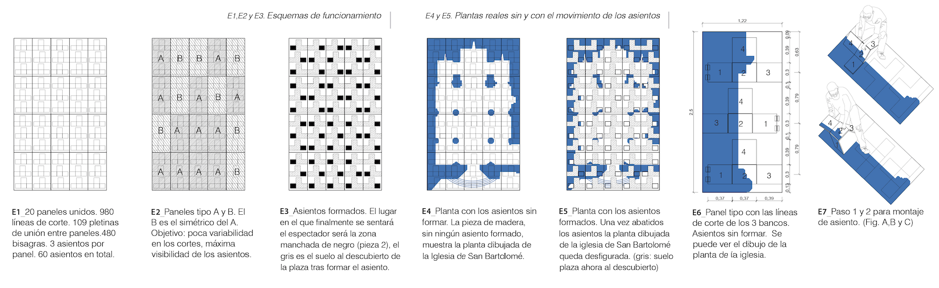 Por otra parte sobre cada uno de los paneles se perfilan 3 asientos; éstos, formados por 4 piezas unidas por un sistema de bisagras empotradas en la madera, hacen, al abatirse, que el suelo deje de ser suelo para pasar a ser asiento. Al realizar esta acción la planta dibujada de la iglesia de San Bartolomé se desfigura, haciendo visible la puesta en uso del elemento.