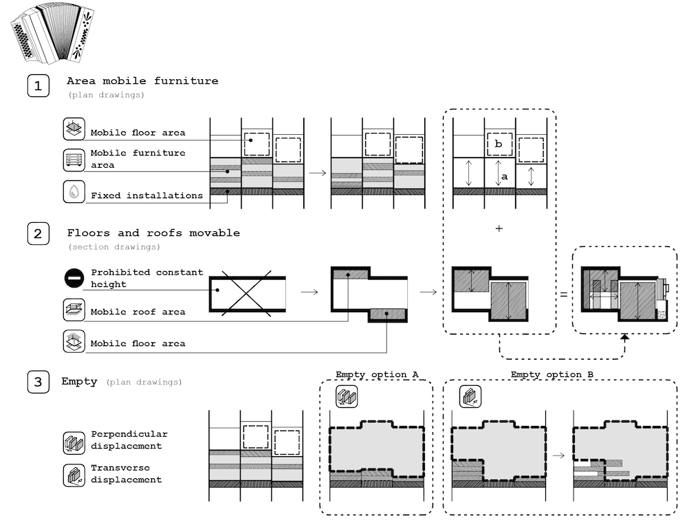 Las viviendas se basan en un esquema acordeón, en el sentido de que pueden plegarse o desplegarse ofreciendo más o menos estancias en función de la demanda.