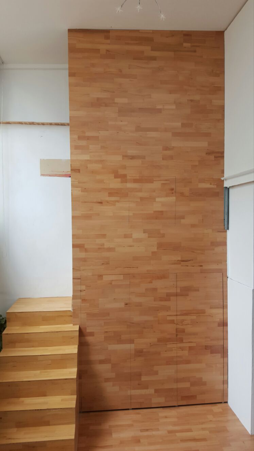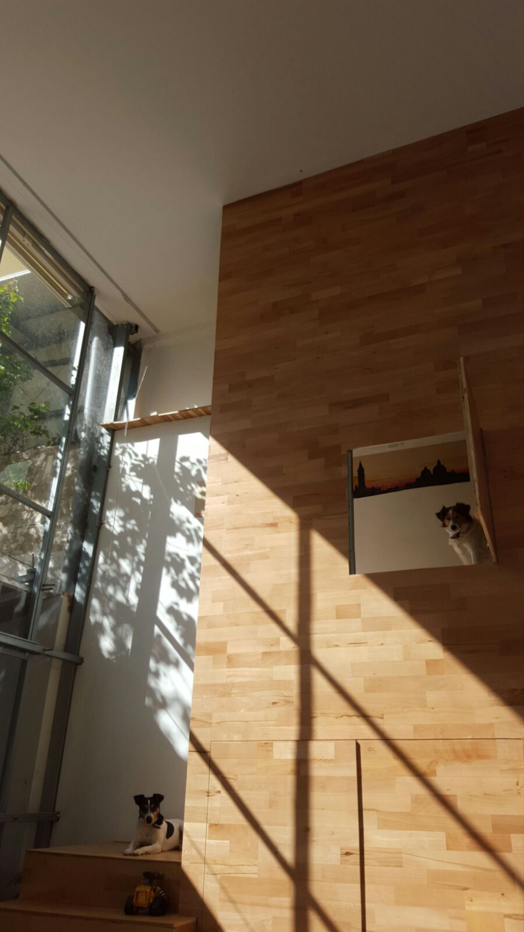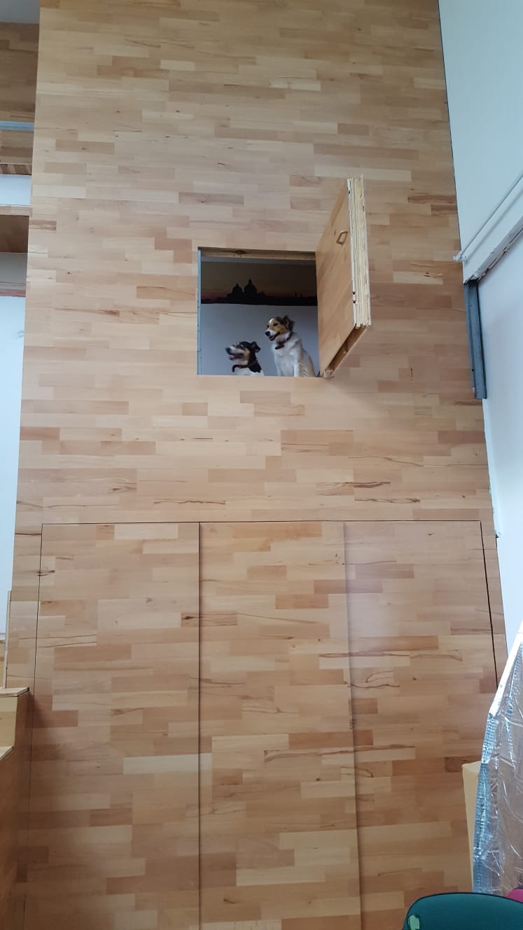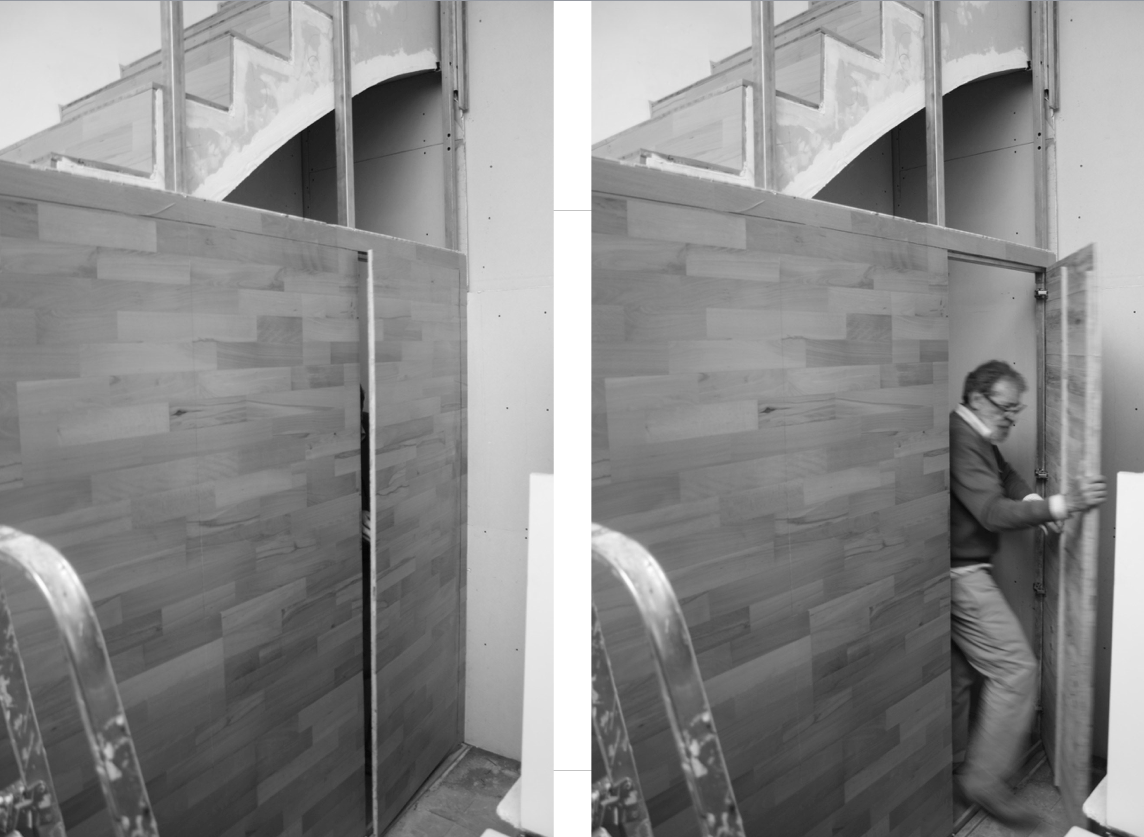 Para acceder a la planta alta es necesario pasar por una escalera escondida tras una pared de madera que a modo de torreón dispone de aperturas para la vista del espacio a diversas cotas.