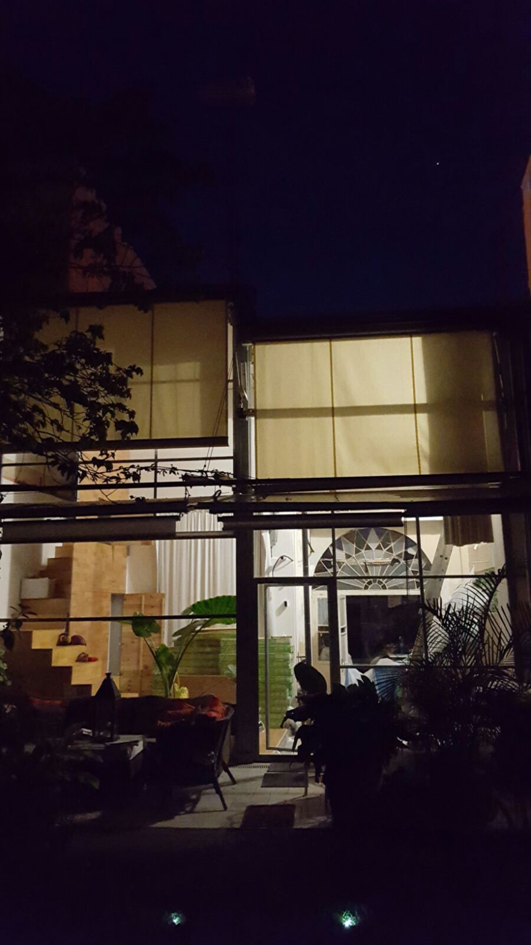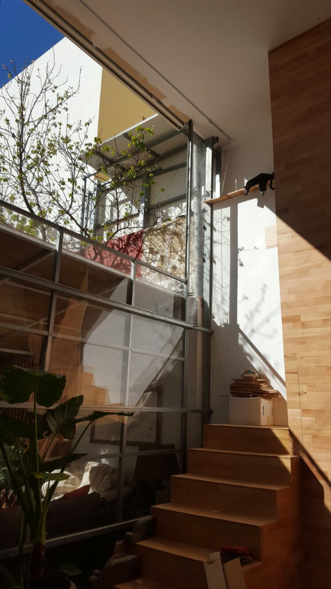 Este proyecto procura ser una fuente de luz y ventilación para toda la casa. Nace a partir de una doble altura que se incorpora sobre la casa primitiva recogiendo, como si de una mano se tratase, lo construido. Dicha colmatación se realiza a partir de una construcción ligera cuyo paño vertical se cierra a partir de una superficie acristalada móvil, de forma que , como si de un escenario de teatro se tratase el inquilino de la vivienda puede subir o bajar la superficie en función del uso que se haga del doble espacio. Y es que en verano, cuando las temperaturas son altas, parte de la superficie superior del paño se puede bajar y parte de la inferior subir – por medio de un sistema de poleas motorizado- dejando que el aire y el frescor del patio de la casa entre al interior de la misma. Solo hace falta provocar una cierta corriente de aire mediante la abertura de algún hueco en el otro extremo de la casa.
