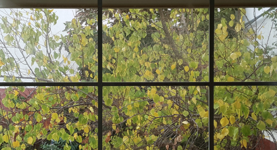 El paño acrisolada deja que la visibilidad hacía el patio sea completa desde cualquier punto interior de la casa, así desde la planta baja podemos ver los troncos de los árboles y desde la planta primera ver la copa de los mismos.