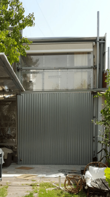 Es importante tener en cuenta que parte de la superficie acristalada está protegida mediante unos vuelos, forrados de madera por el interior y de chapa ondulada por el exterior, que hacen de porche. Dichos vuelos, de 3 metros de longitud, también están motorizados, de modo que si los inquilinos de la vivienda dejan durante sus vacaciones -por ejemplo- la vivienda vacía, el porche puede abatirse para pasar de ser techo y a ser cerramiento.